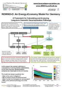 Description of the modeling tool REMIND-D used for scenario creation process of the project ENCI-Lowcarb in Germany. REMIND-D has been developed by the Potsdam Institute for Climate Impact Research. The basic purpose of REMIND-D is to provide a quantitative framework for analyzing long-term domestic mitigation scenarios for Germany. REMIND-D facilitates an integrated analysis of the long-term interplay between technological mitigation options in the different sectors as well as macroeconomic dynamics.