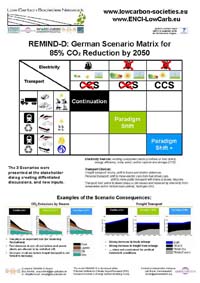 Presentation of model-based mitigation scenarios for Germany developed within the project ENCI-LowCarb. The scenarios integrate the technological, economic and socio-political dimensions of ambitious domestic CO2 abatement. Civil society stakeholders from the transport and electricity sector framed the boundary conditions for the energy-economy model REMIND-D and evaluated the scenarios by means of a participatory approach. All scenarios achieve 85% CO2 emission reduction in 2050 relative to 1990.