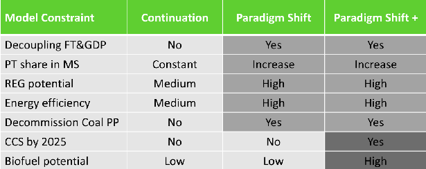 In the German study, the outcomes of the stakeholder workshops were translated into scenario elements, called parsimonious narratives. Those scenario parameters that were judged to be realistic by the stakeholders constituted the “continuation scenario” and those that were desirable constituted the “Paradigm shift scenario”. The “Paradigm shift + scenario” included additional elements that were not widely accepted by the stakeholders.